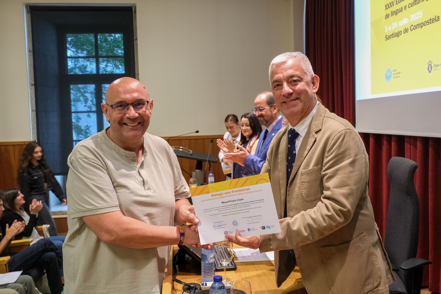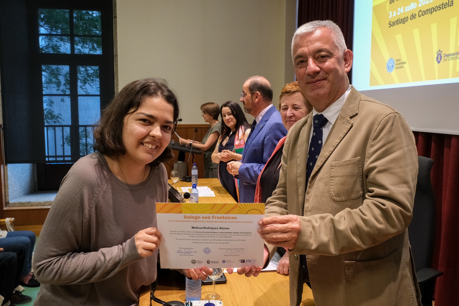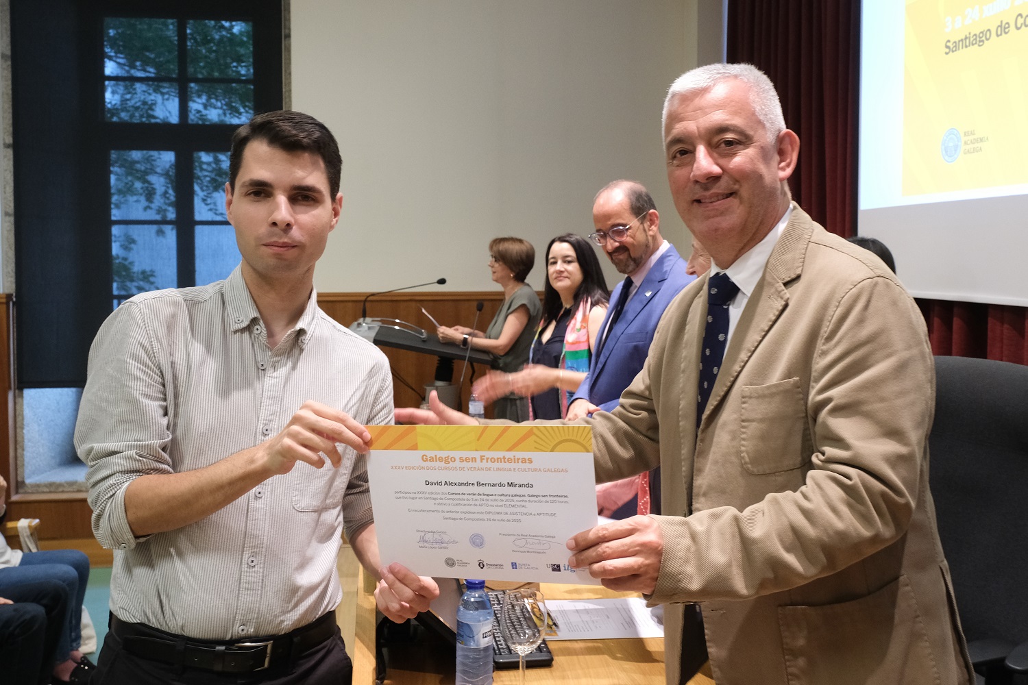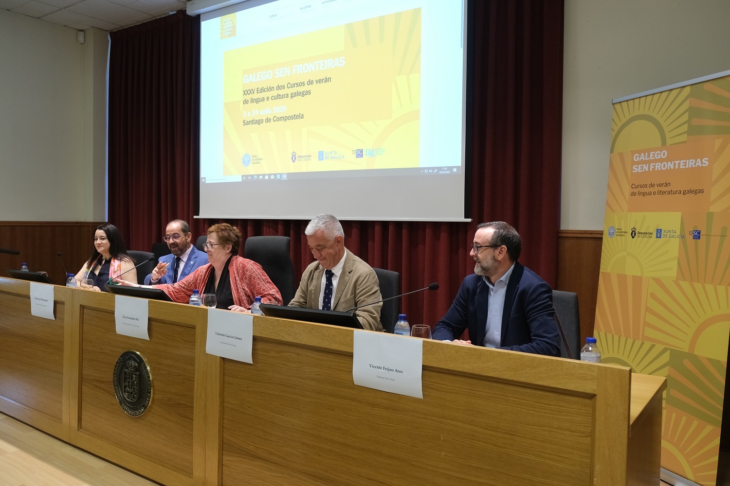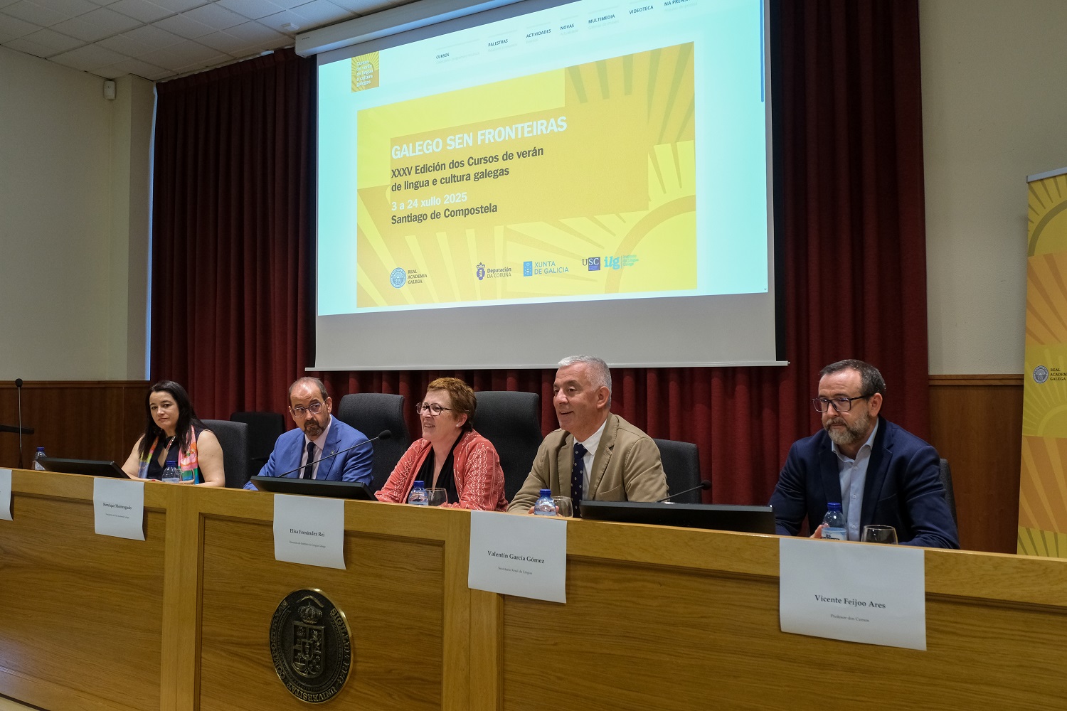 A Real Academia Galega e o Instituto da Lingua Galega da Universidade de Santiago de Compostela clausuraron os cursos que desde 1988 coorganizan no verán compostelán e por cuxas aulas pasaron xa máis de 2.500 estudantes. Henrique Monteagudo interveu no acto de clausura xunto á directora dos Cursos, a académica María López-Sández; a directora do ILG, Elisa Fernández Rei; o secretario xeral da Lingua, Valentín García; e mais o filólogo da RAG Vicente Feijoo, en representación do profesorado.