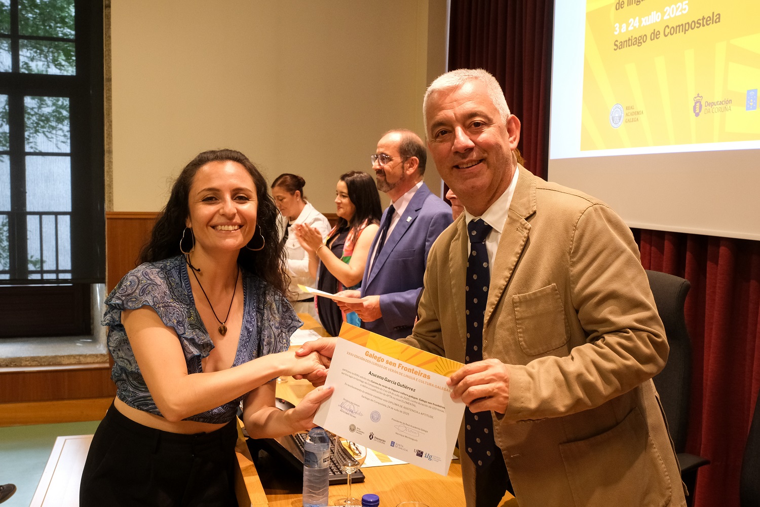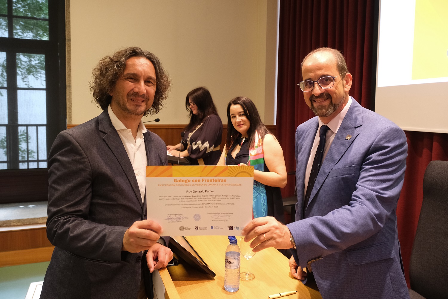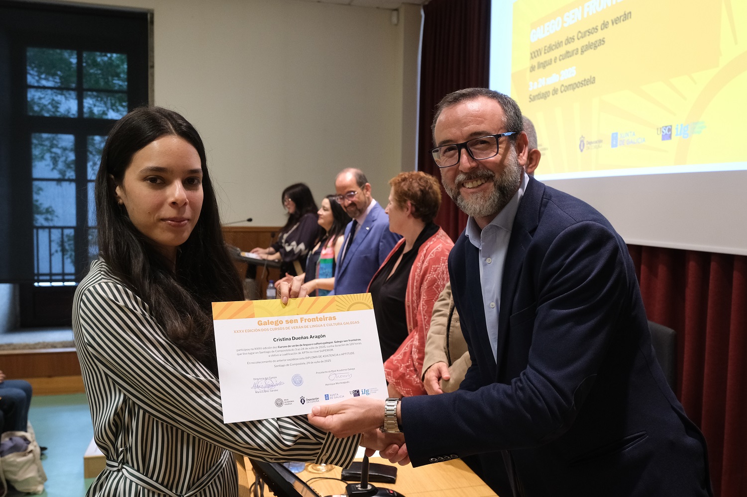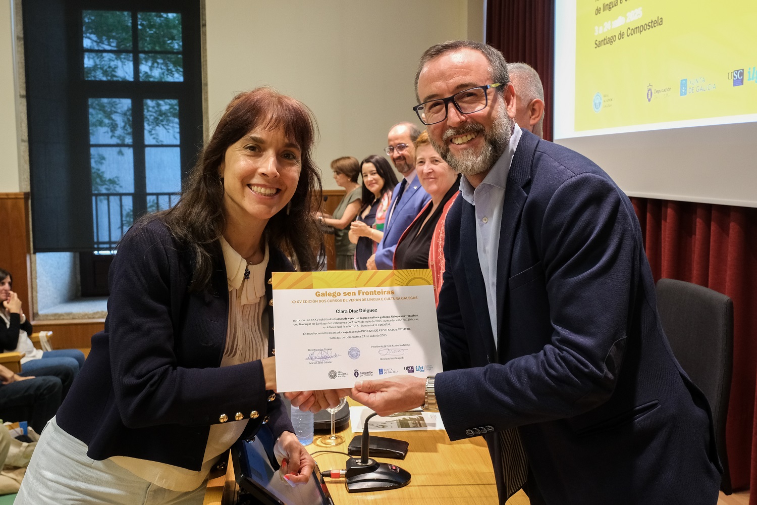 A Real Academia Galega e o Instituto da Lingua Galega da Universidade de Santiago de Compostela clausuraron os cursos que desde 1988 coorganizan no verán compostelán e por cuxas aulas pasaron xa máis de 2.500 estudantes. Henrique Monteagudo interveu no acto de clausura xunto á directora dos Cursos, a académica María López-Sández; a directora do ILG, Elisa Fernández Rei; o secretario xeral da Lingua, Valentín García; e mais o filólogo da RAG Vicente Feijoo, en representación do profesorado.