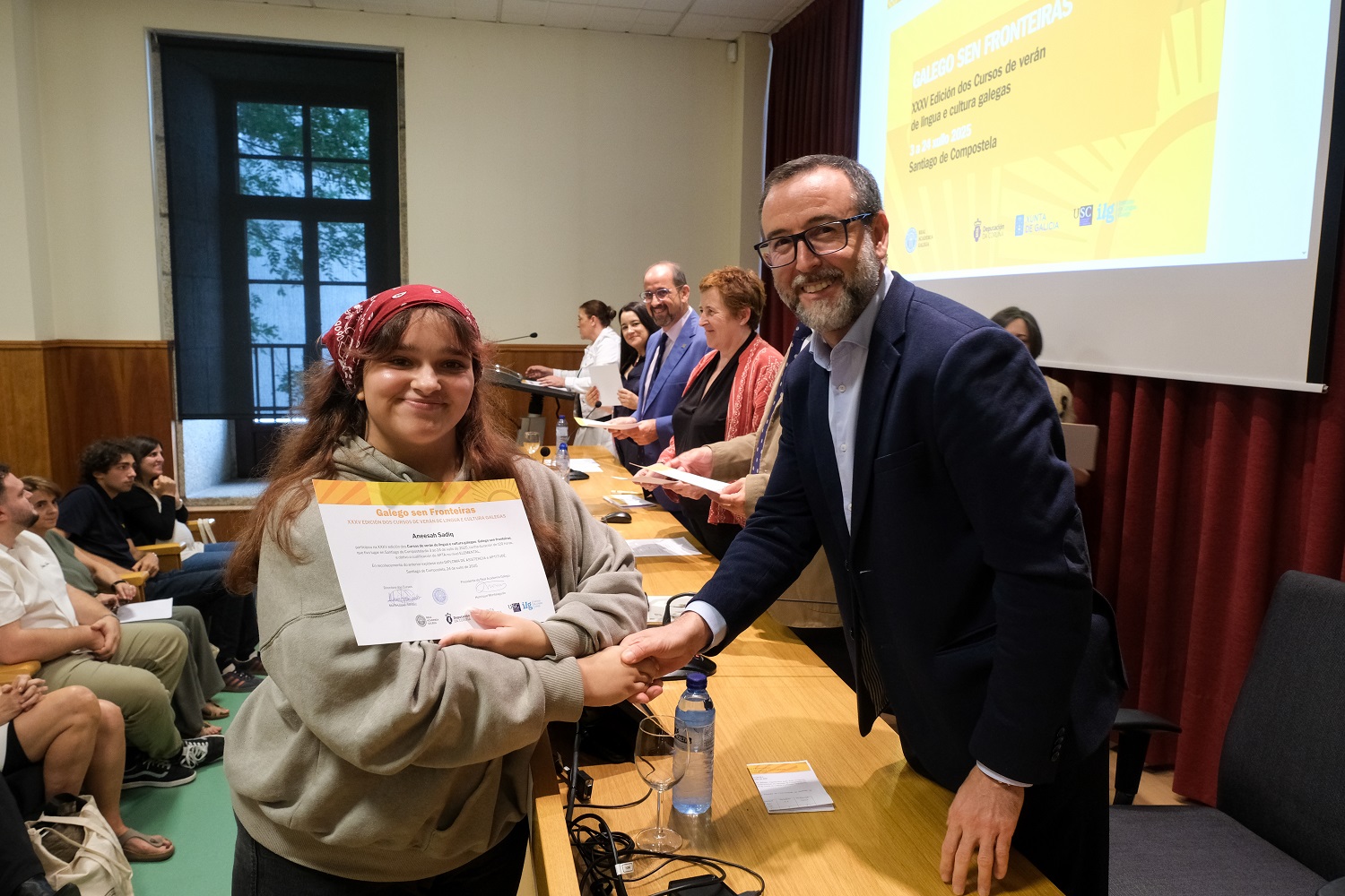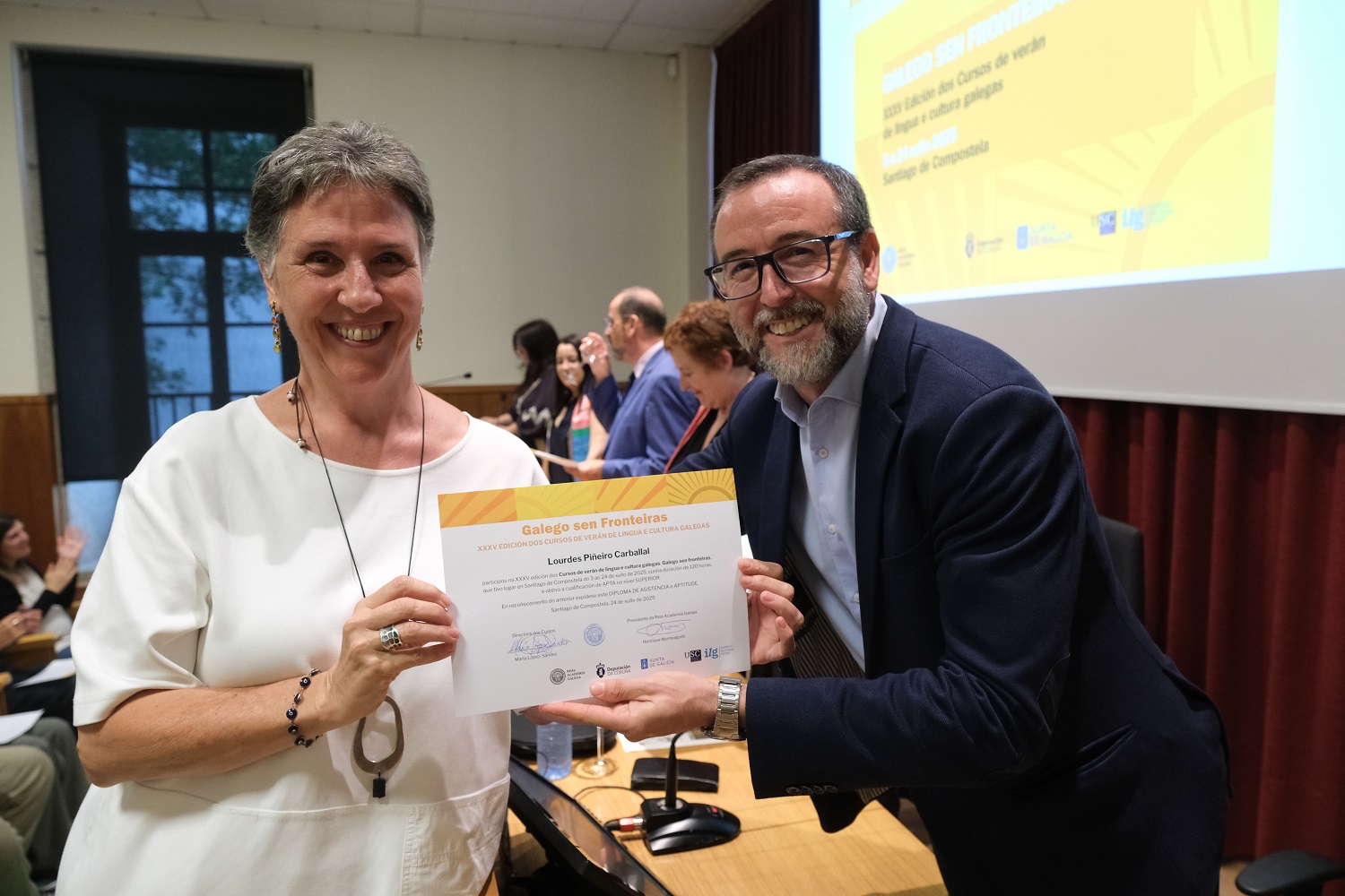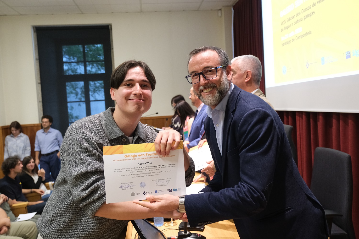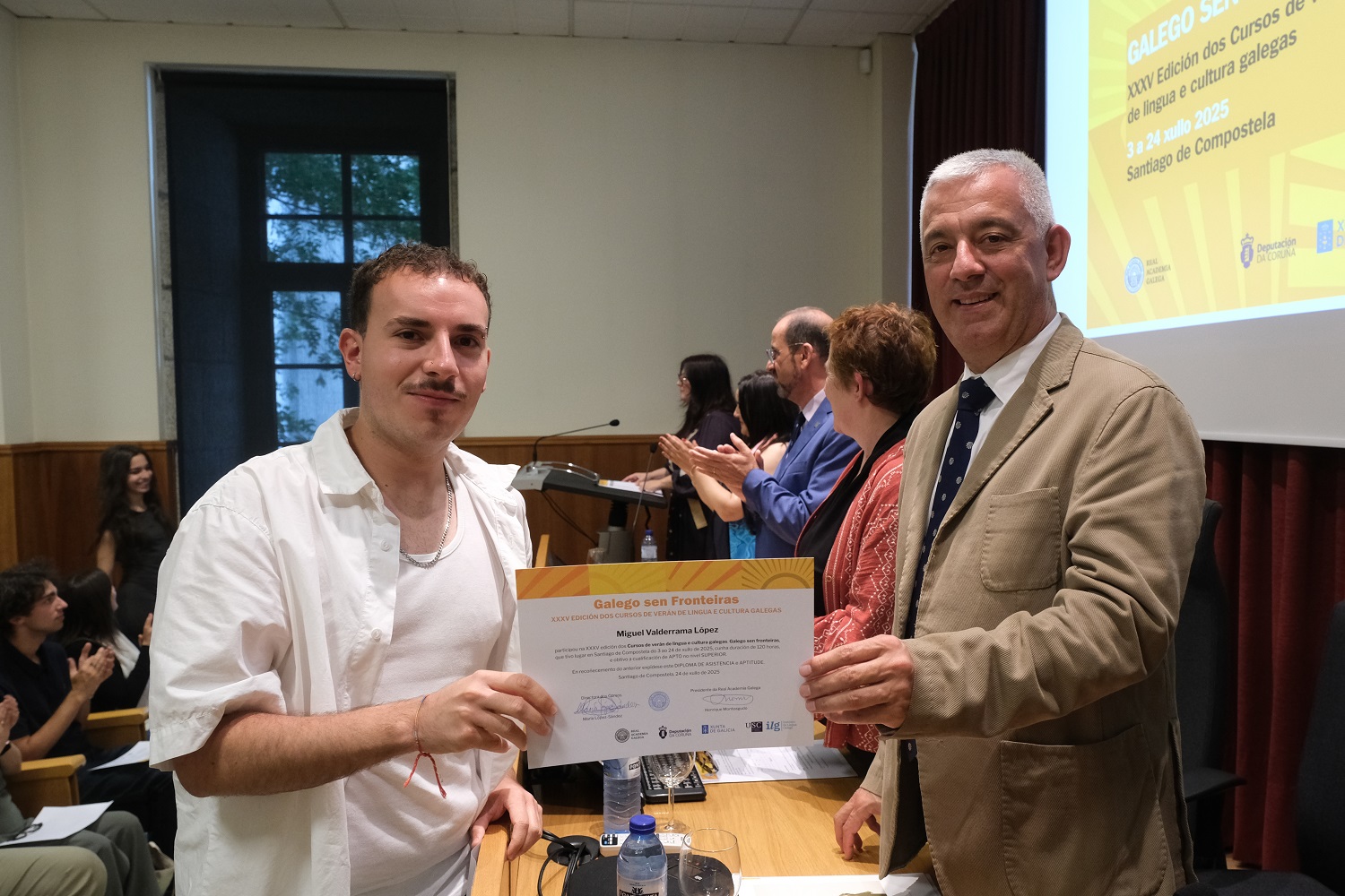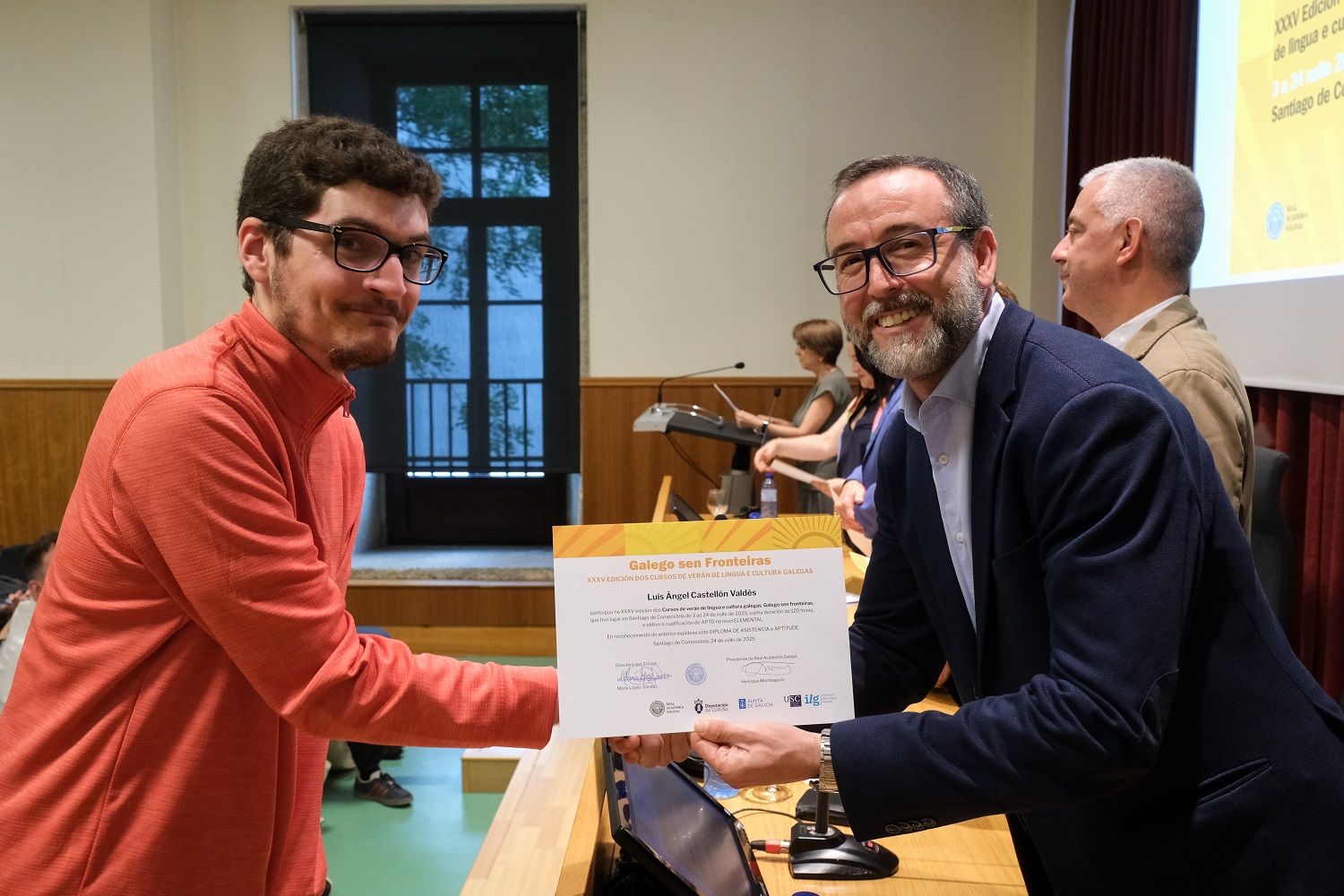 A Real Academia Galega e o Instituto da Lingua Galega da Universidade de Santiago de Compostela clausuraron os cursos que desde 1988 coorganizan no verán compostelán e por cuxas aulas pasaron xa máis de 2.500 estudantes. Henrique Monteagudo interveu no acto de clausura xunto á directora dos Cursos, a académica María López-Sández; a directora do ILG, Elisa Fernández Rei; o secretario xeral da Lingua, Valentín García; e mais o filólogo da RAG Vicente Feijoo, en representación do profesorado.
