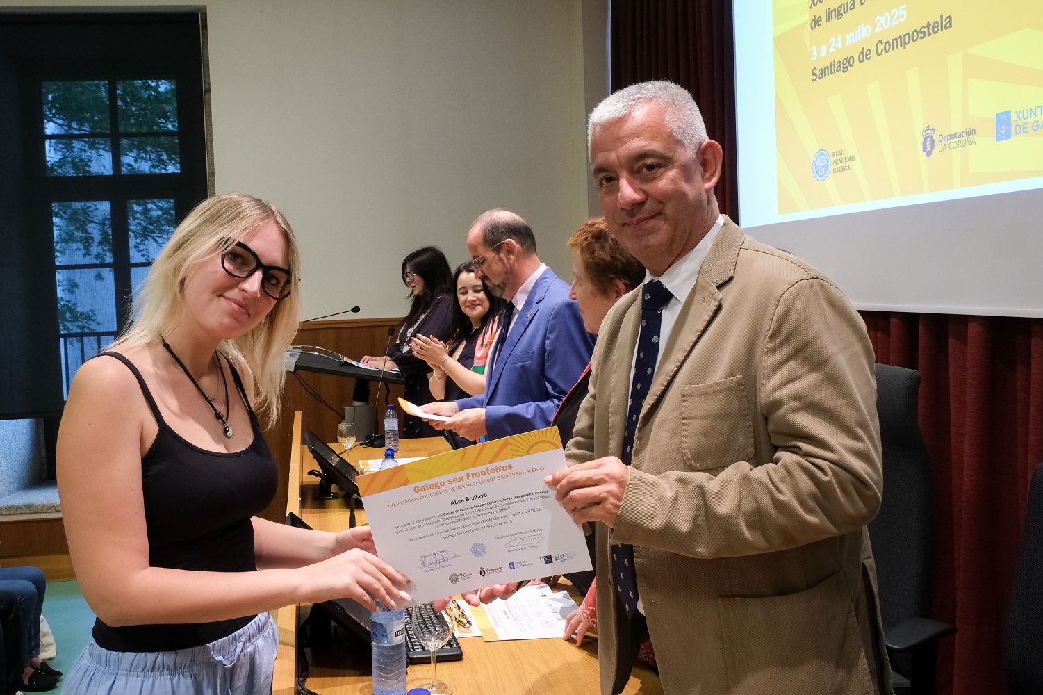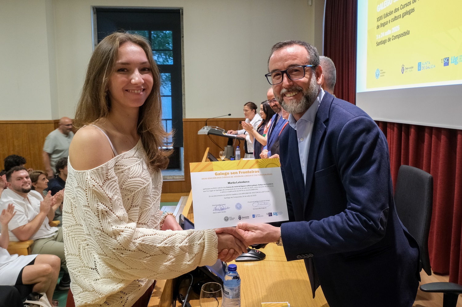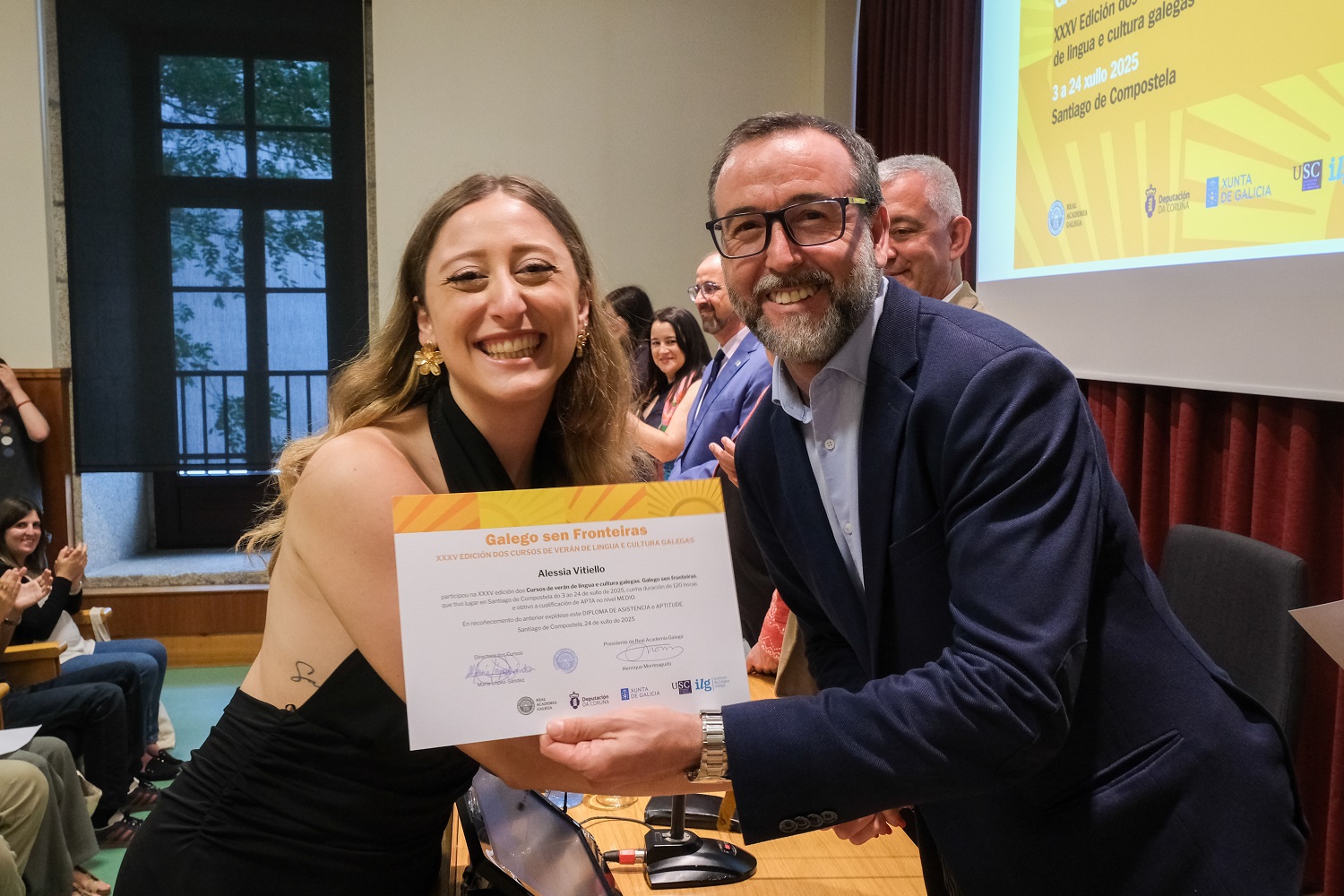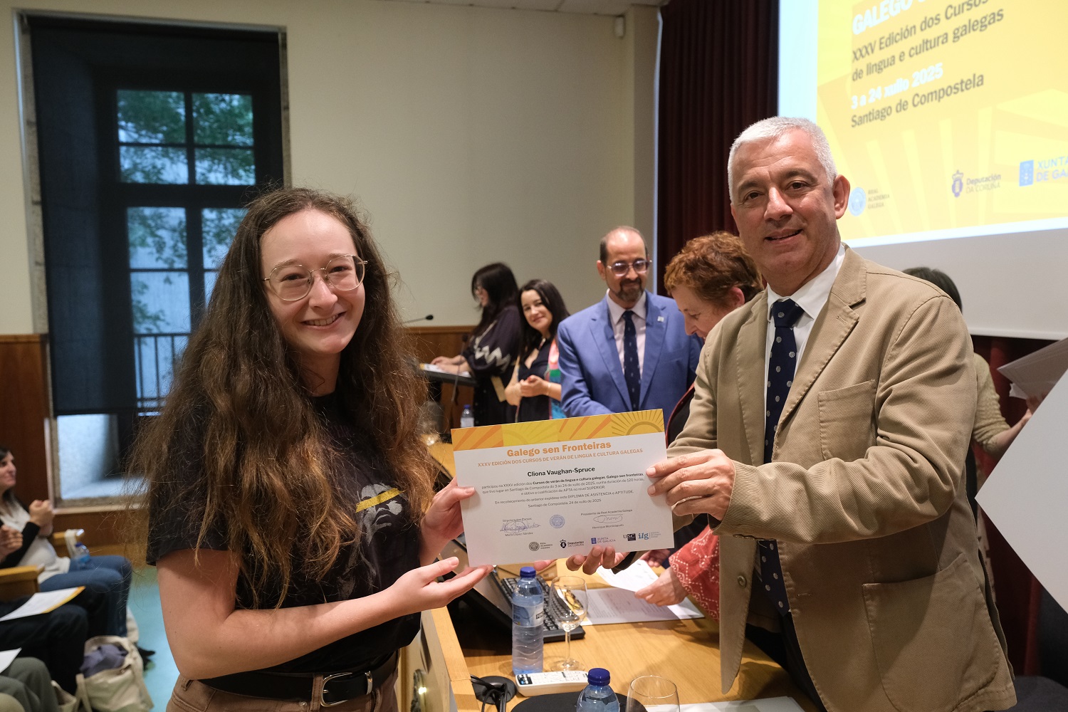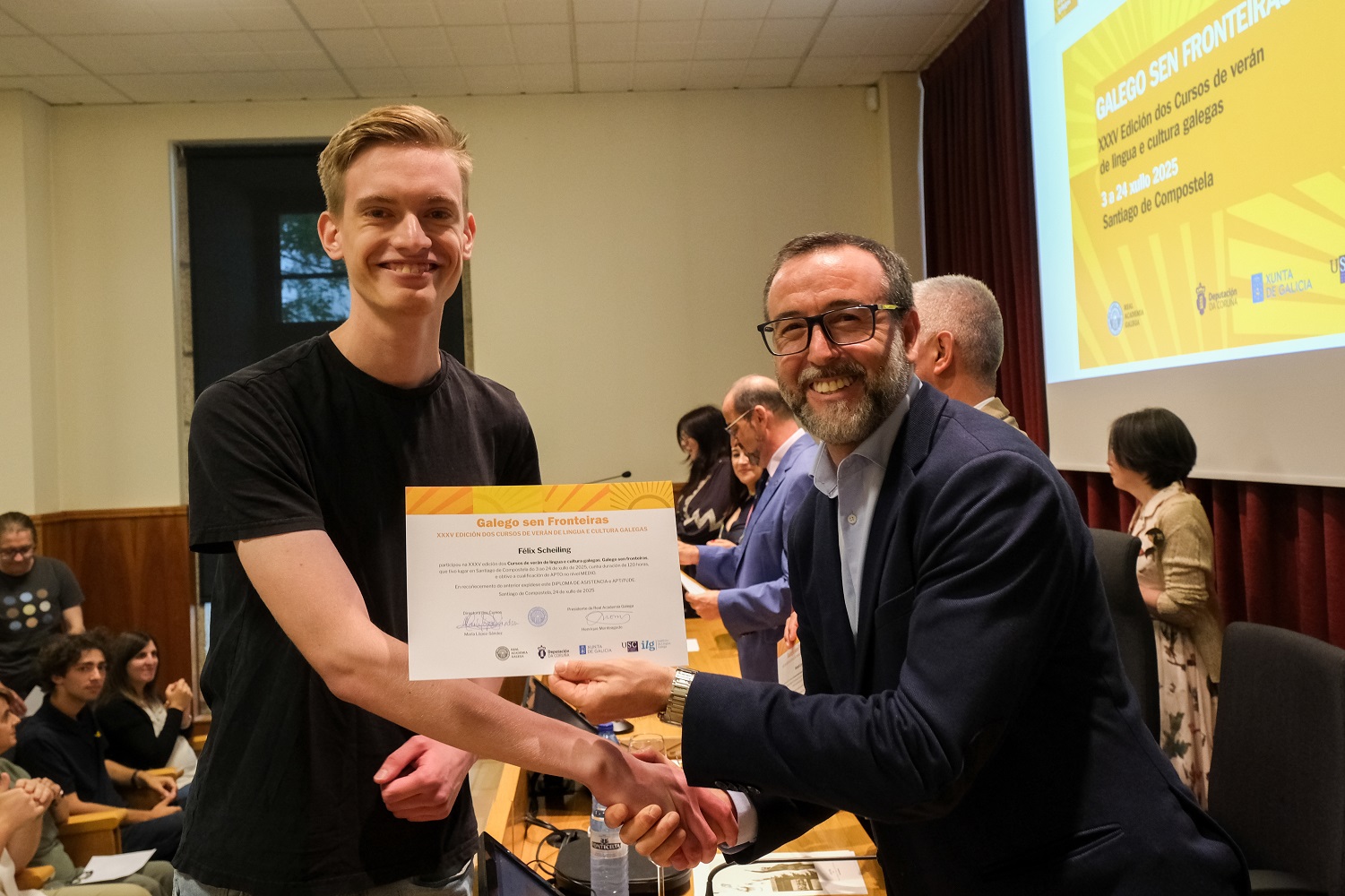 A Real Academia Galega e o Instituto da Lingua Galega da Universidade de Santiago de Compostela clausuraron os cursos que desde 1988 coorganizan no verán compostelán e por cuxas aulas pasaron xa máis de 2.500 estudantes. Henrique Monteagudo interveu no acto de clausura xunto á directora dos Cursos, a académica María López-Sández; a directora do ILG, Elisa Fernández Rei; o secretario xeral da Lingua, Valentín García; e mais o filólogo da RAG Vicente Feijoo, en representación do profesorado.